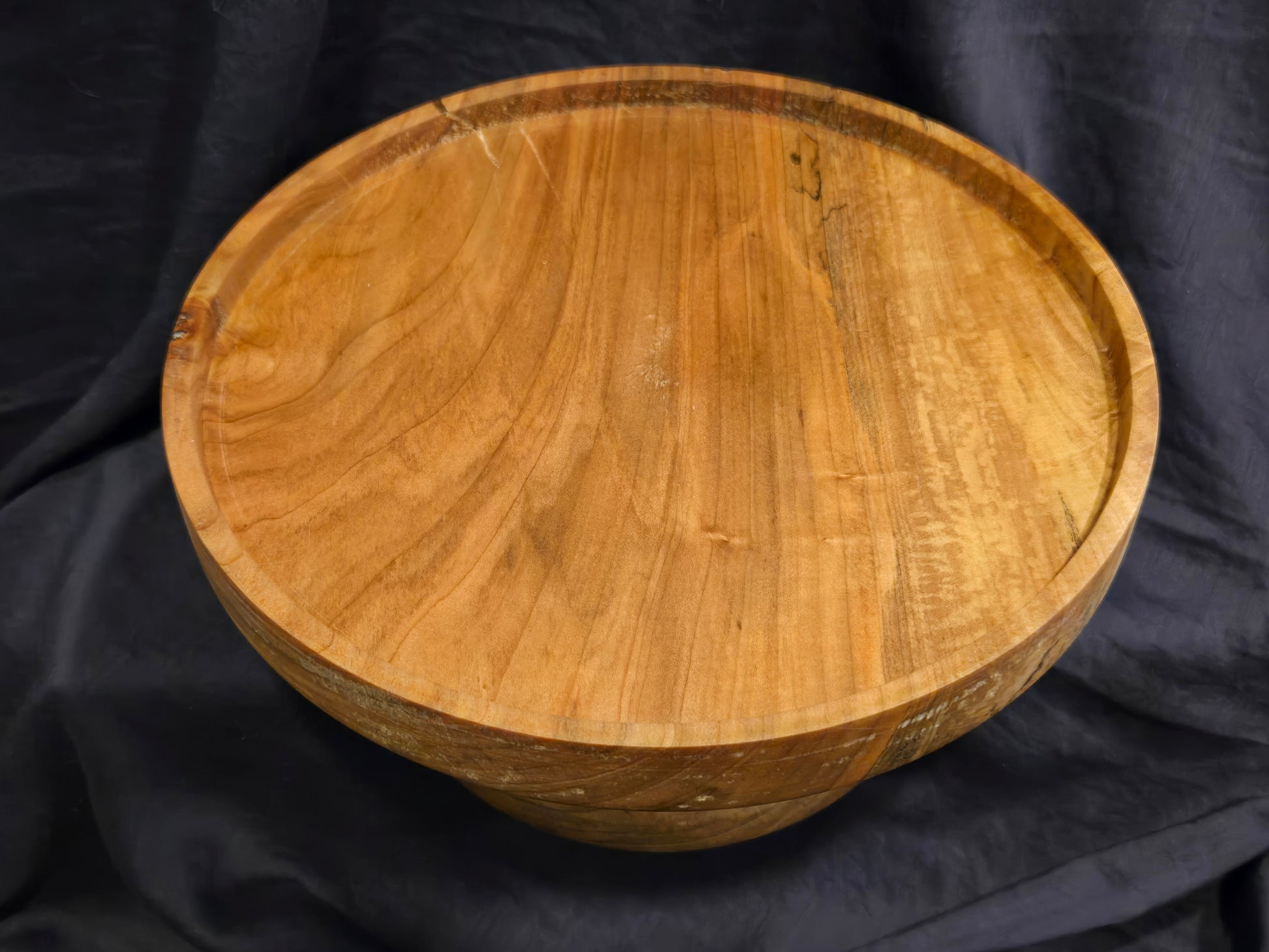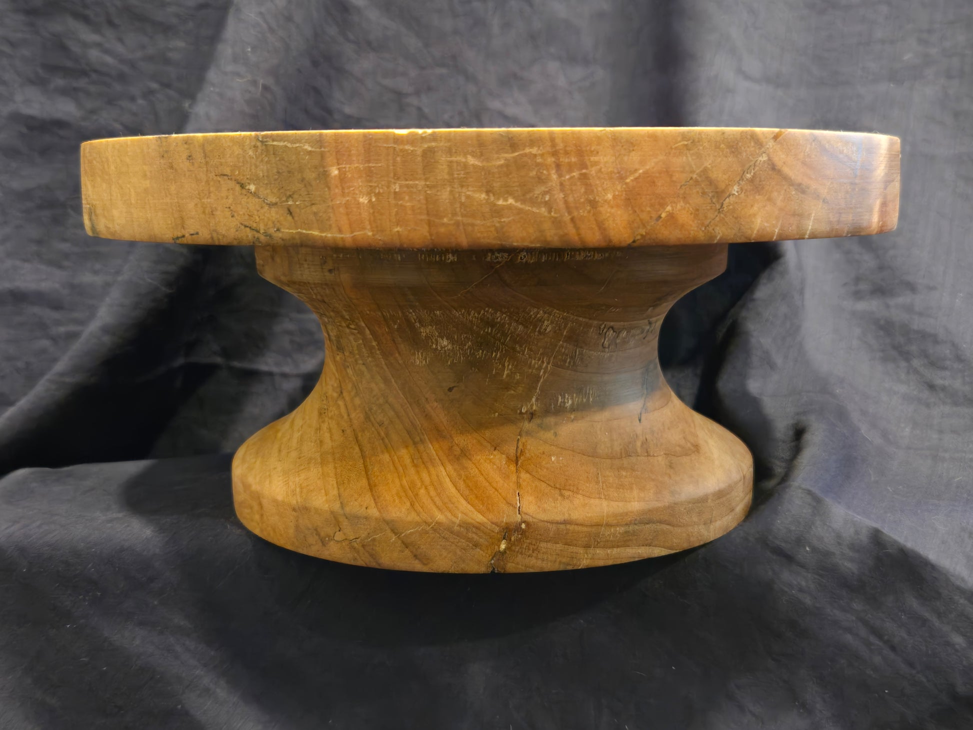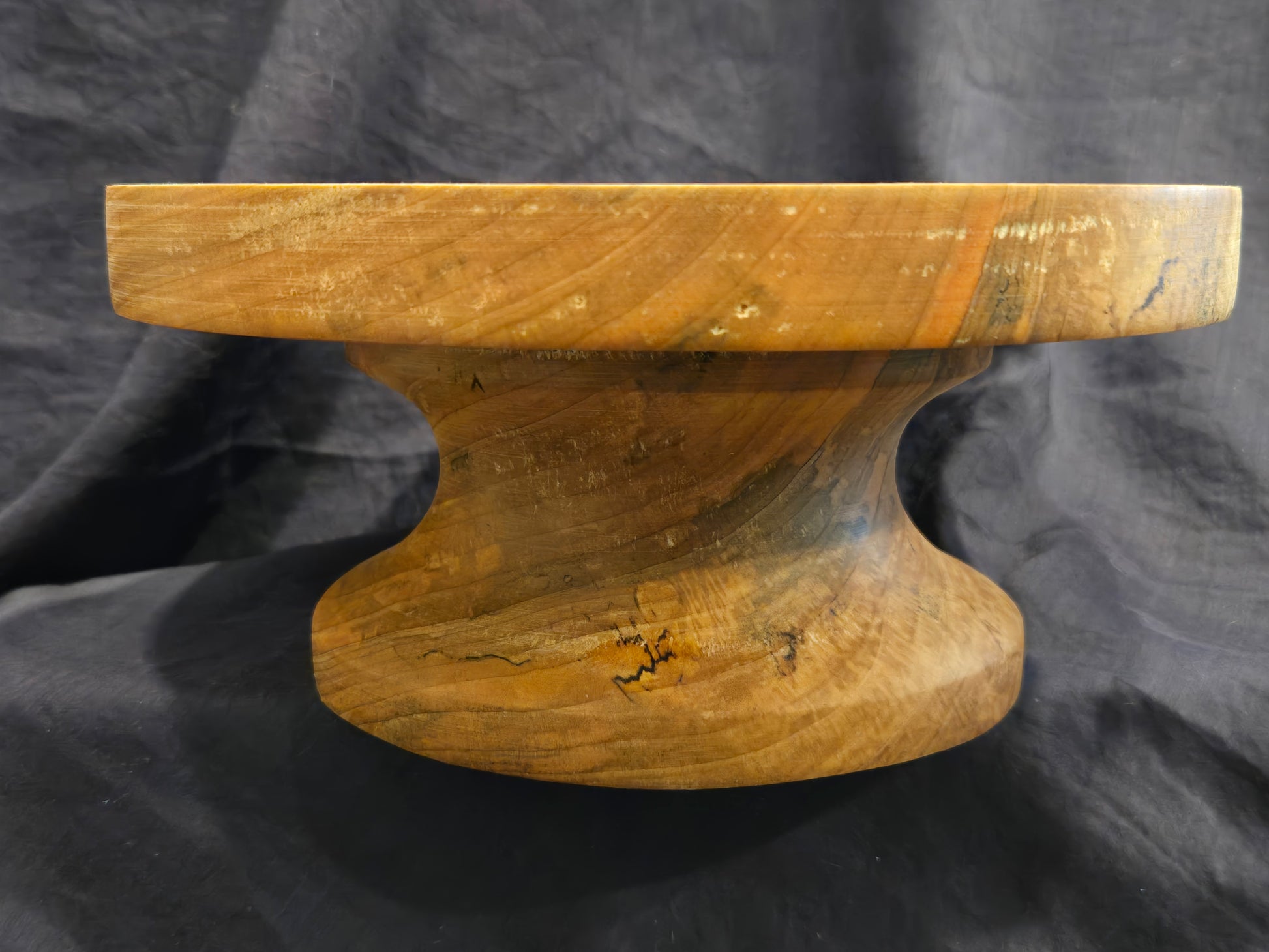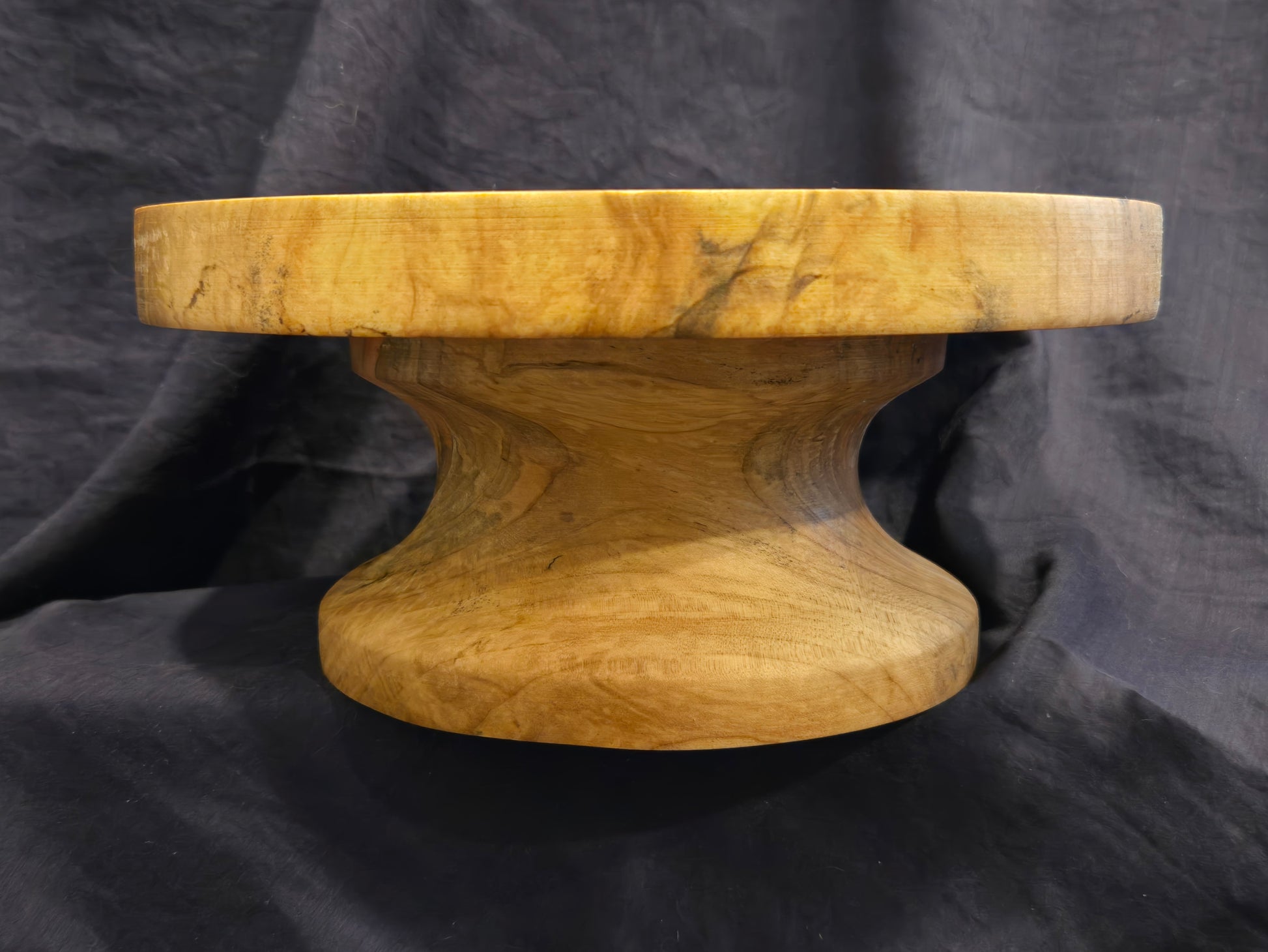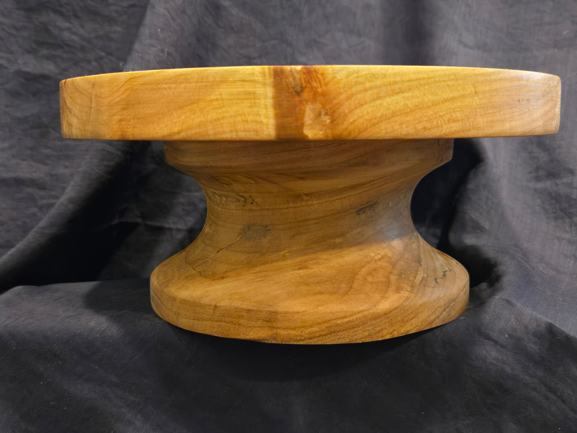 The display surface of this cake stand measures 8½” in diameter to comfortable hold an 8” round cake inside the gently raised lip. Finished with cutting board, this piece requires minimal maintenance. A simple reapplication of cutting board oil whenever it visually appears to be dry will maintain this cake stand for years to come.