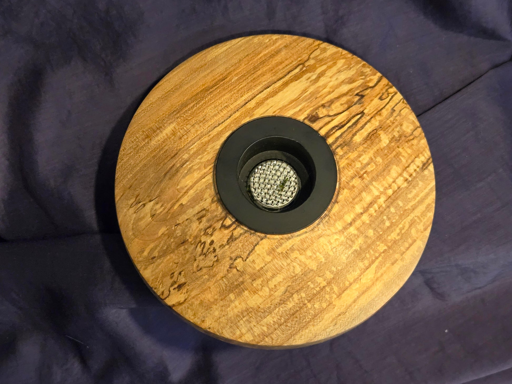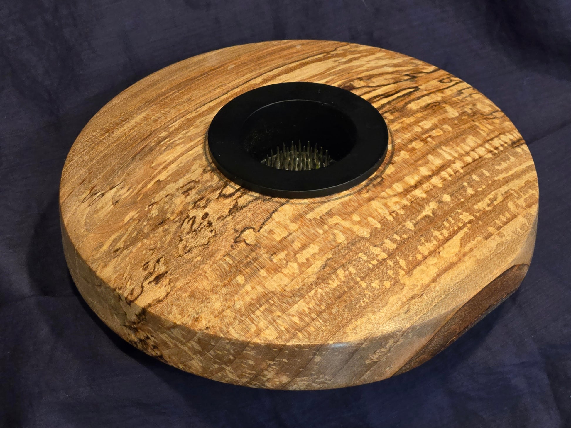 This disc-shaped flower frog was turned out of heavily spalted maple that maintained a small patch of bark on the outer edge. The frog opening measures 1.75 inches (4.4 cm) across, ample space for a small flower arrangement.