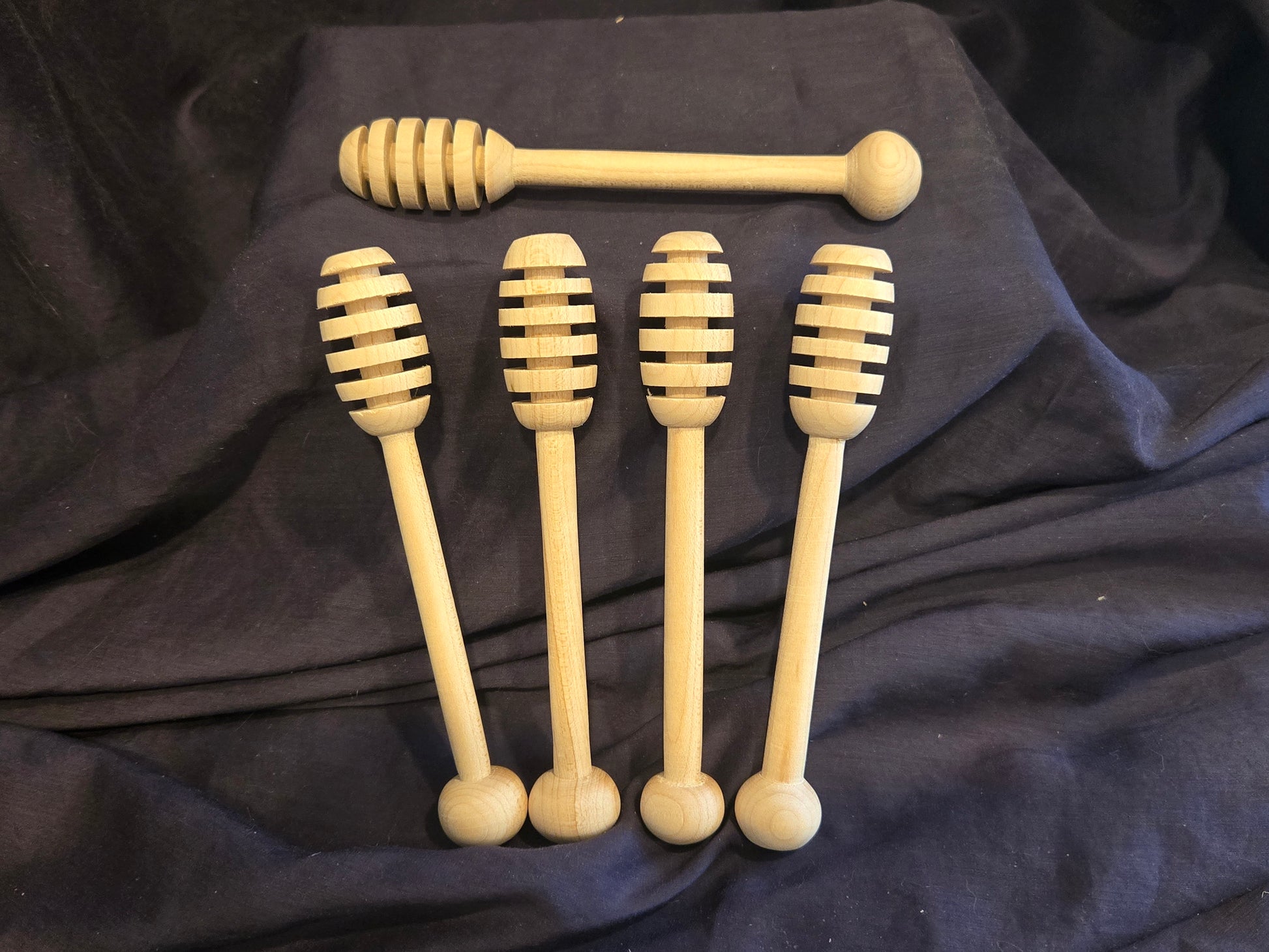 Turned from poplar or maple, these honey dippers have five slots in the dipping head, providing an efficient means of extracting honey from a honey jar or pot without the mess associated with spooning or pouring.