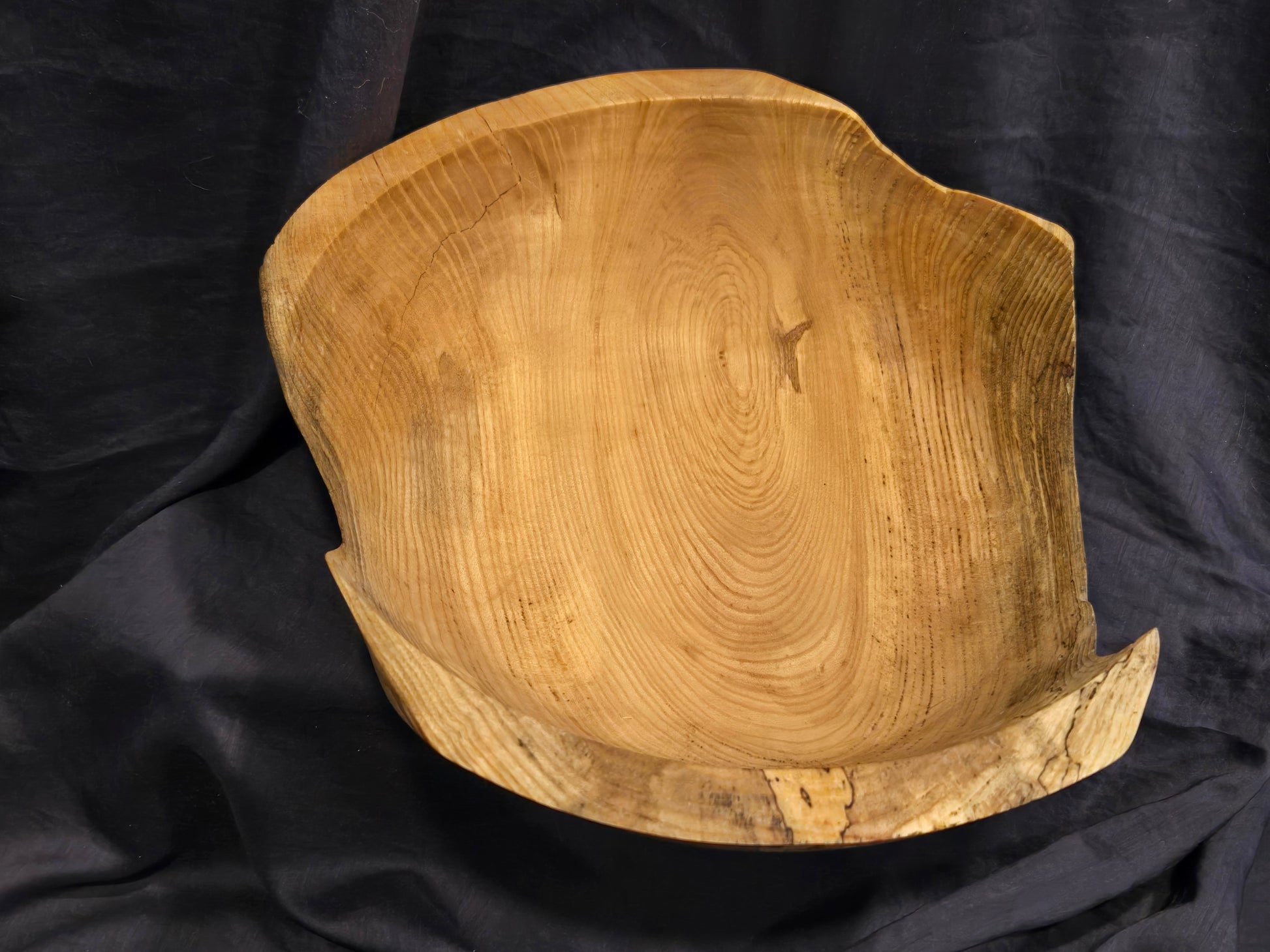A uniquely shaped bowl turned from a log of spalted ash. This bowl displays its growth-rings and subtle shading variations, growing darker towards the edge of the bowl where the characteristic spalting is found. It is finished in a mat-luster urethane.
