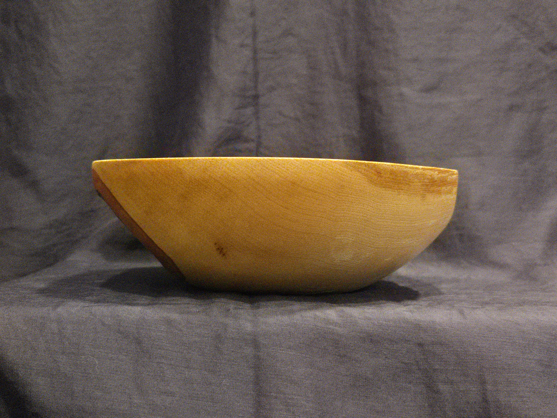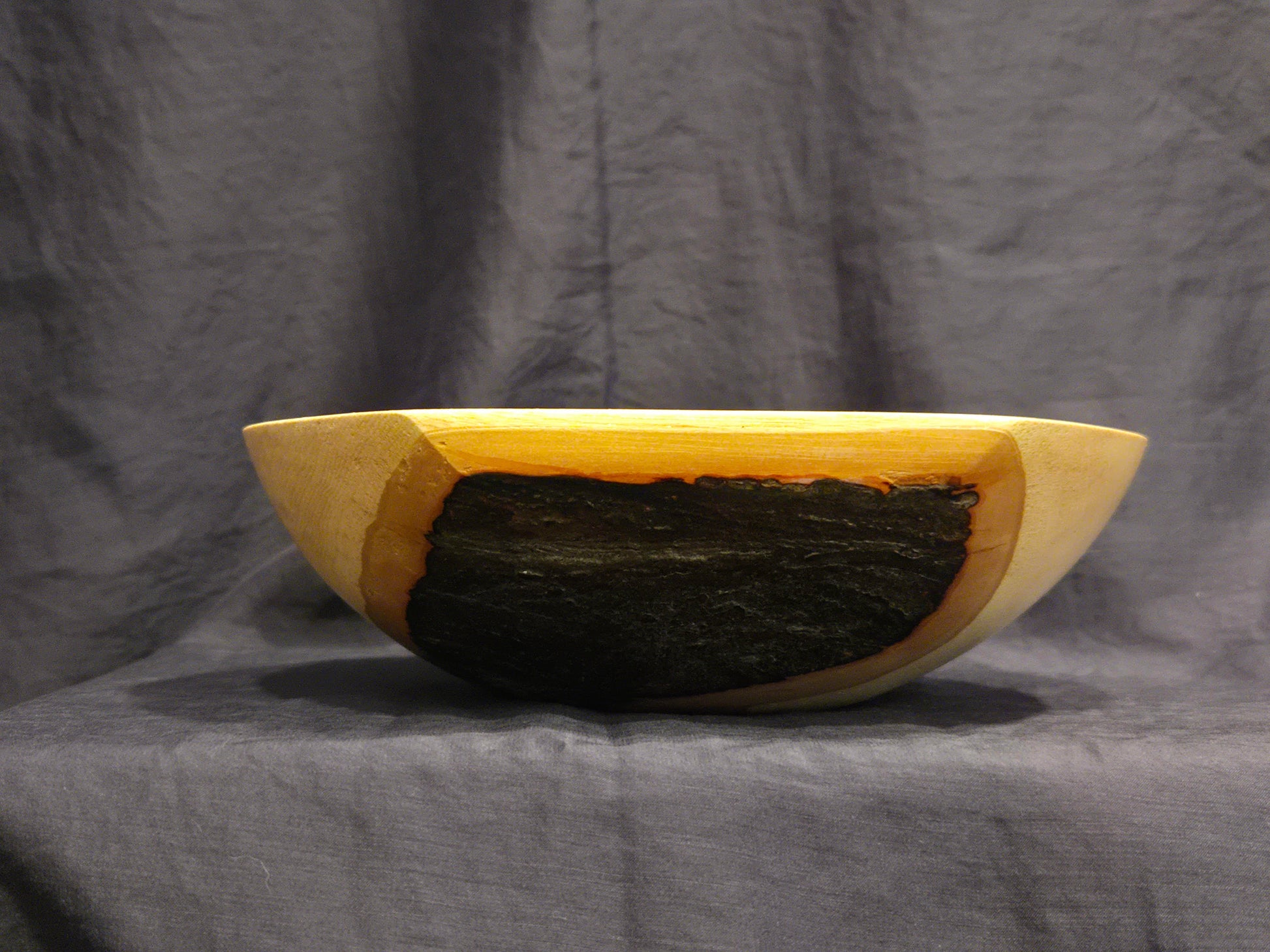 A “round bowl” with two straight sides is just part of the charm of this bowl. Turned from shag bark hickory the bowl highlights the different shades of hickory. Almost dead center in the bowl is a small clover shaped bark inclusion that expands outward as it moves to the bottom of the bowl. Further character is developed by the large patch of bark which covers the exterior of one of the straight sides.