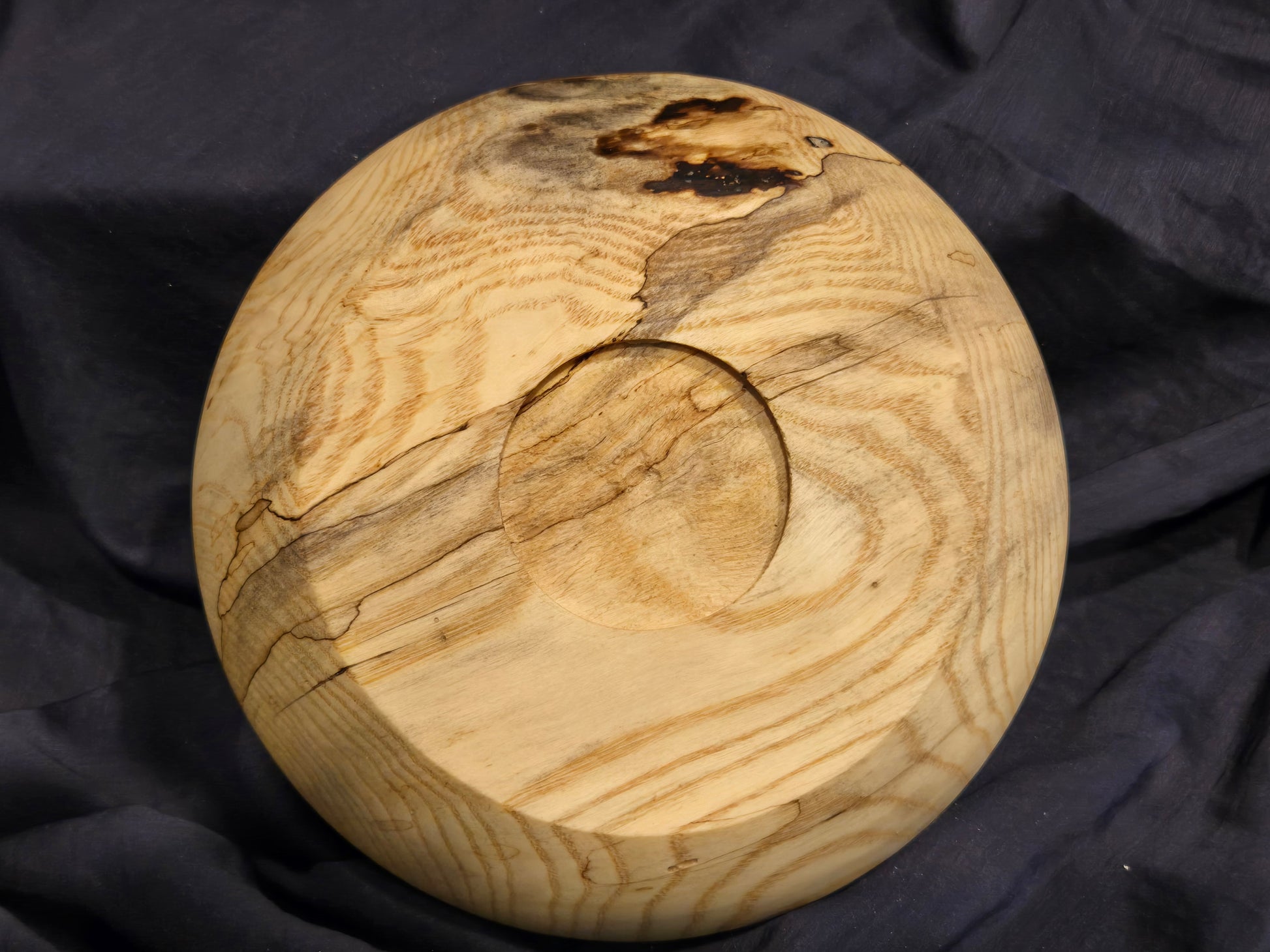 A very fine line of spalting traces its way across the base and exterior of this bowl. Turned from a blond shag bark hickory blank makes the wood grain patterns simply visually pop both inside and out.